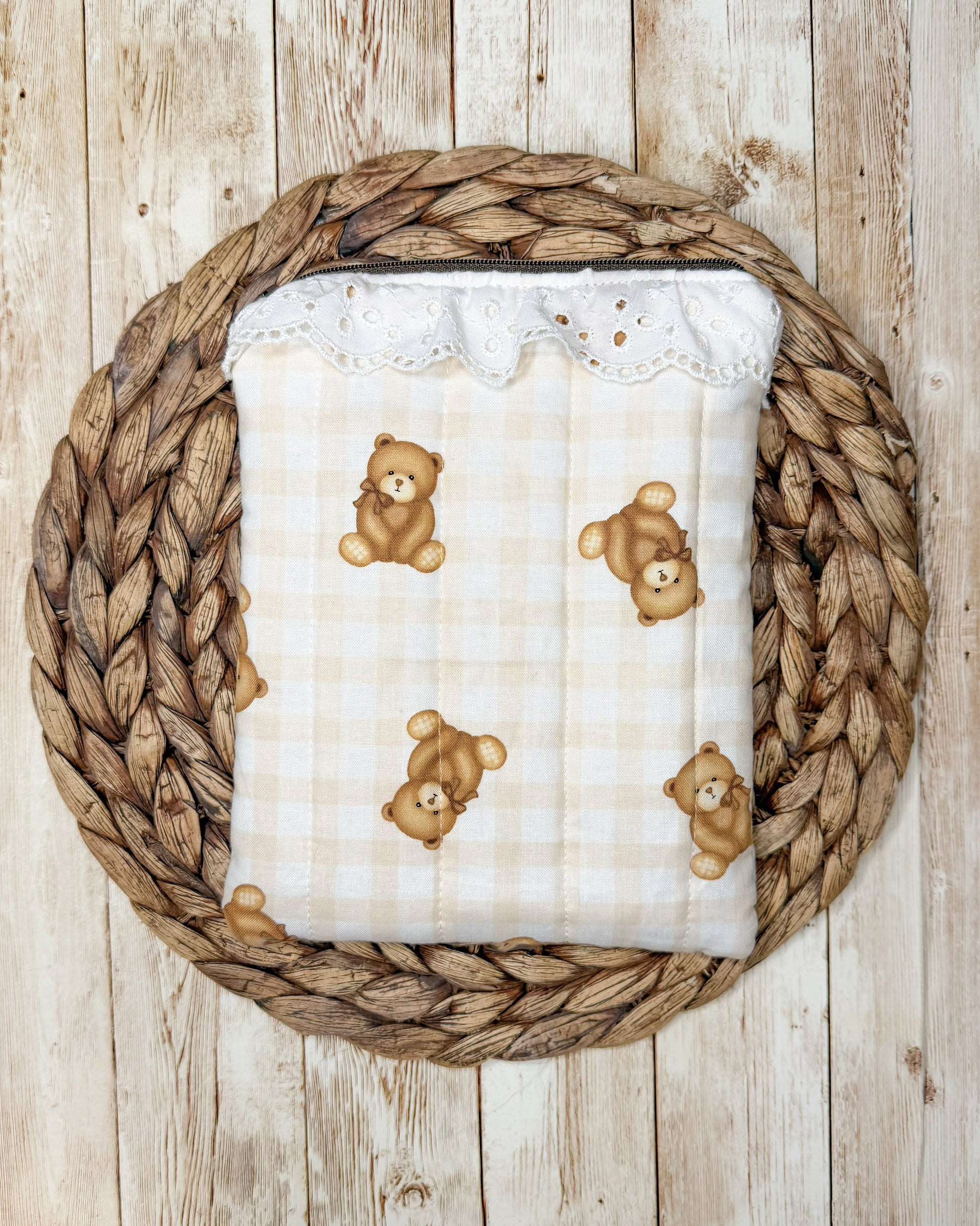 Gingham Teddy Quilted Kindle Sleeve with Zipper and Ruffles